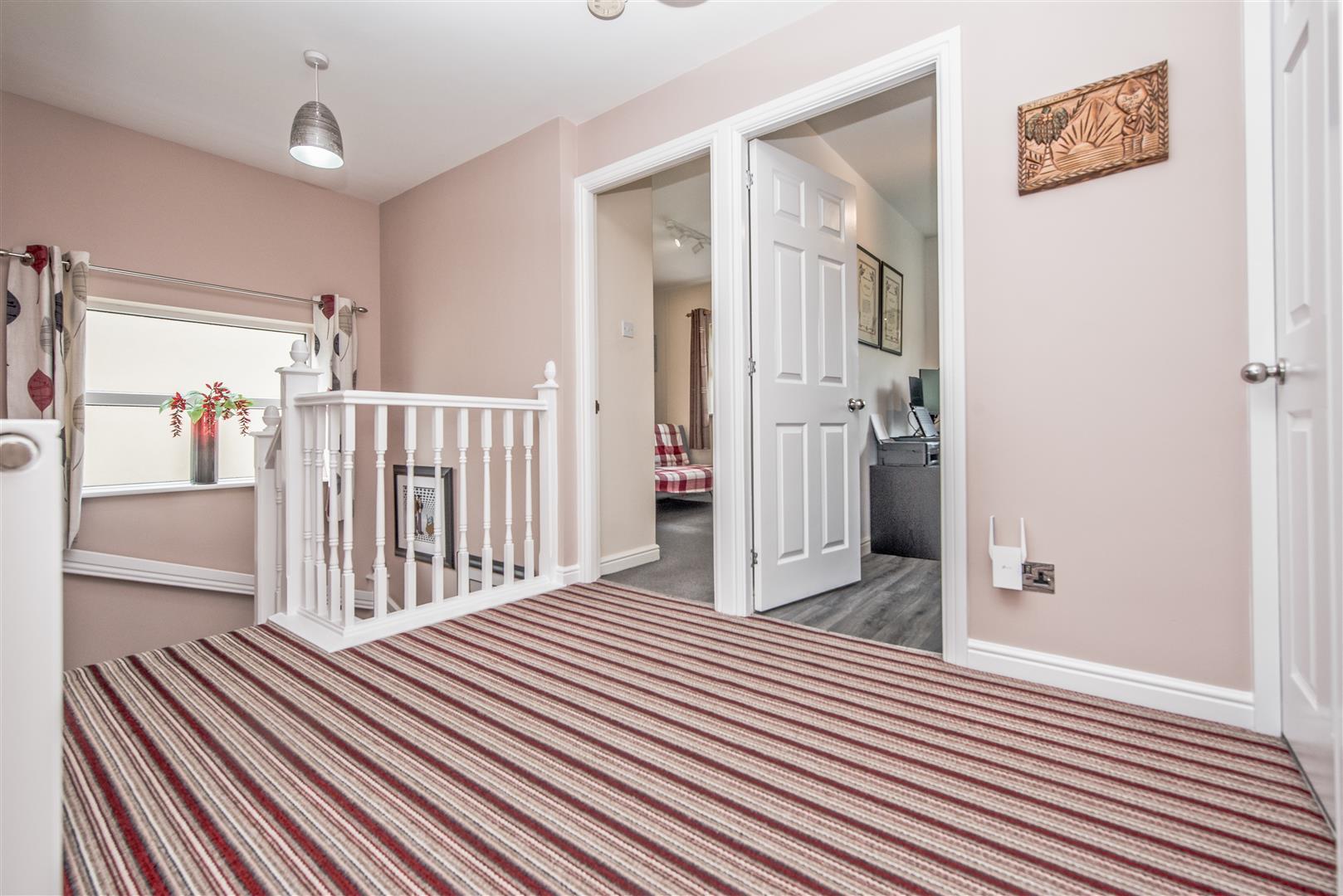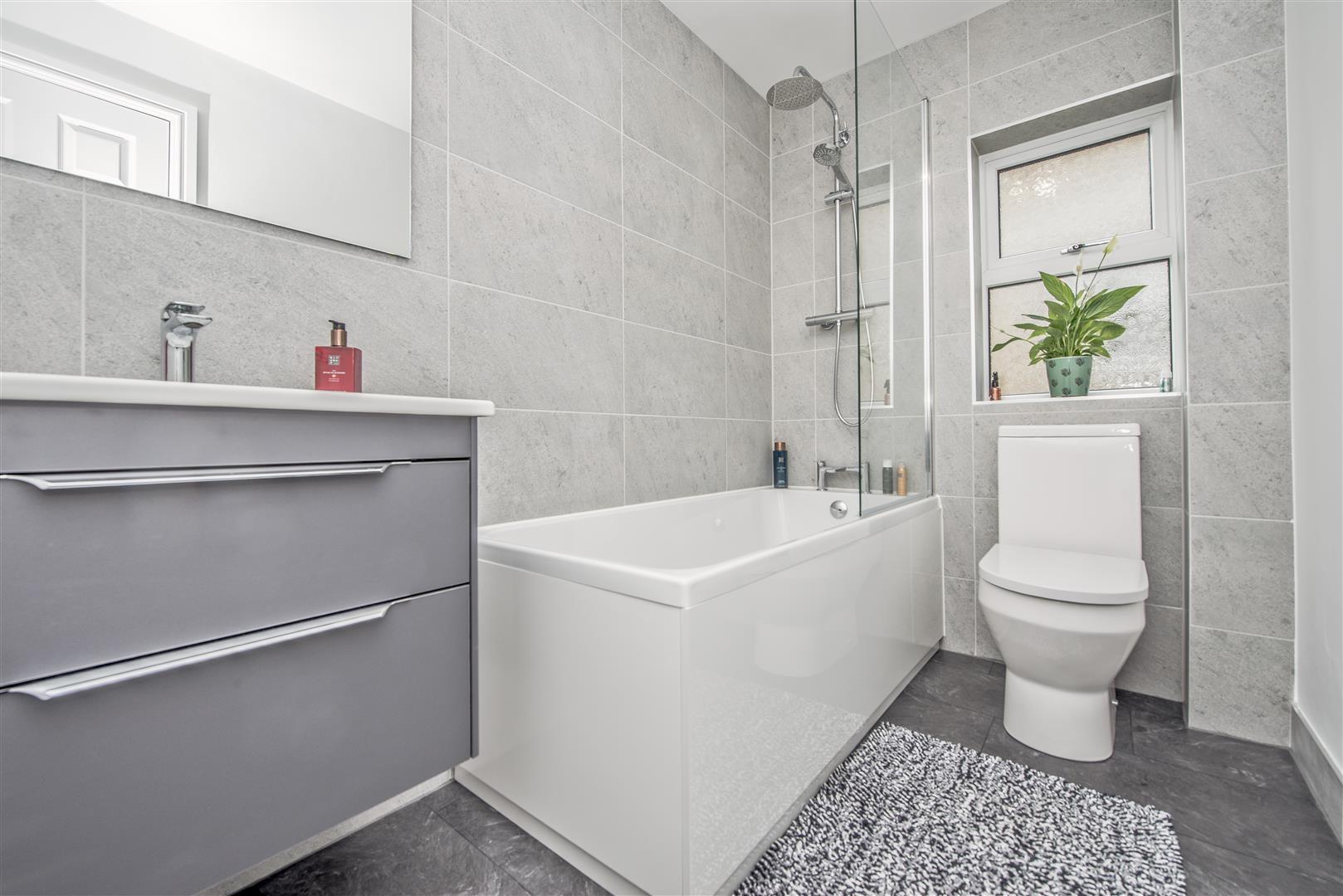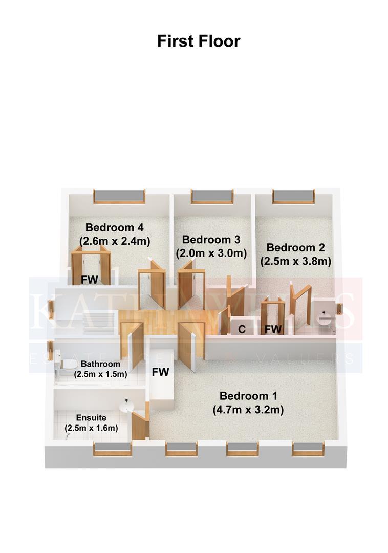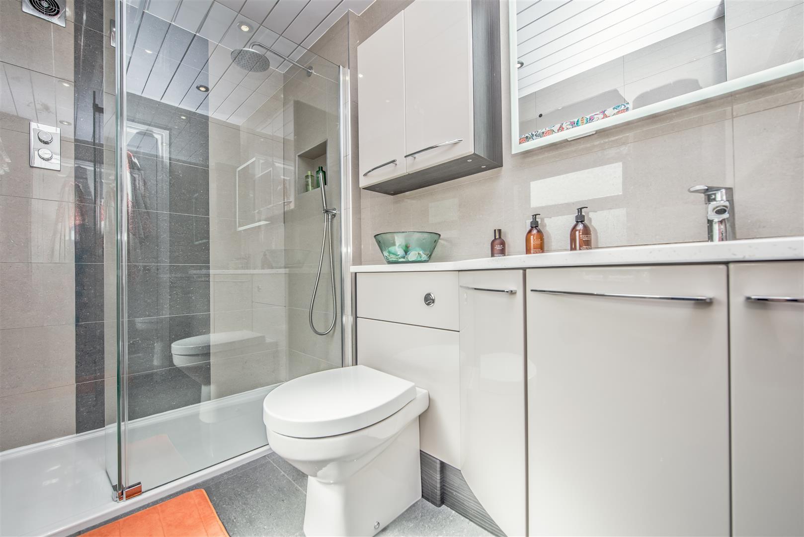 To the first floor there are FOUR DOUBLE BEDROOMS, an EN-SUITE SHOWER ROOM / WC to the master bedroom, an EN-SUITE SHOWER ROOM to bedroom two, and a FAMILY BATHROOM / WC with a modern white suite and a plumbed shower over the bath.